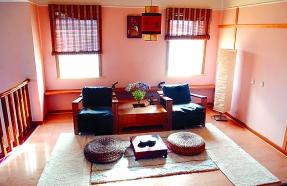 沿着粉色的楼梯墙壁上了二层,眼前就是一个开阔的开放式休闲室。原木色的地台充分显示了这个空间的日式元素(见图①),围棋棋盘桌和两边的蒲草圆垫更是充满了东方风情。后面的沙发和木茶几线条也非常简约。而与之对应的吊顶采用了原木设计,与休闲室的粉色搭配出质朴而甜蜜的感觉。